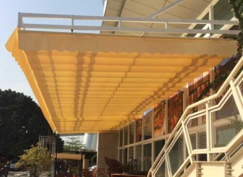 - Lắp đặt mái hiên mái xếp lượn sóng cho trường học giúp bạn tiện lợi điều khiển thu gọn bạt che xếp lớp mở ra không gian thông thoáng và kéo bung bạt che lập tức khi có dấu hiệu thời tiết nắng mưa khắc nghiệt.
